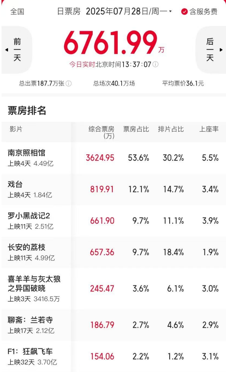 抗战题材影片《南京照相馆》7月25日正式公映后,上映4天票房已超4亿元,位居单日票房榜首,并打破近三年暑期档战争片首映日纪录。