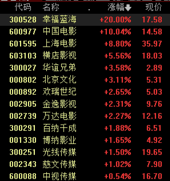 幸福蓝海开盘封死20CM涨停,报17.58元/股,市值为66亿元。此外,中国电影(600977)(600977.SH)在震荡之后也实现涨停,上海电影(601595.SH)大涨8%。