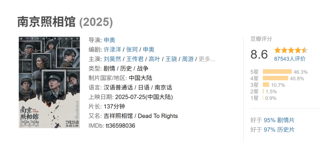 另据灯塔专业版AI票房预测显示,《南京照相馆》总票房预测上调至31.70亿。目前该片的豆瓣评分为8.6。不少观众化身“自来水”(编辑注:“自来水”是一个网络用词,意为一群因为发自内心的喜爱和欣赏之情,或不由自主,或满腔热情,去义务宣传某项活动的粉丝)表示,《南京照相馆》无论题材、叙事角度、演员表现等都可圈可点,“好电影,观众是不会亏待它的。”